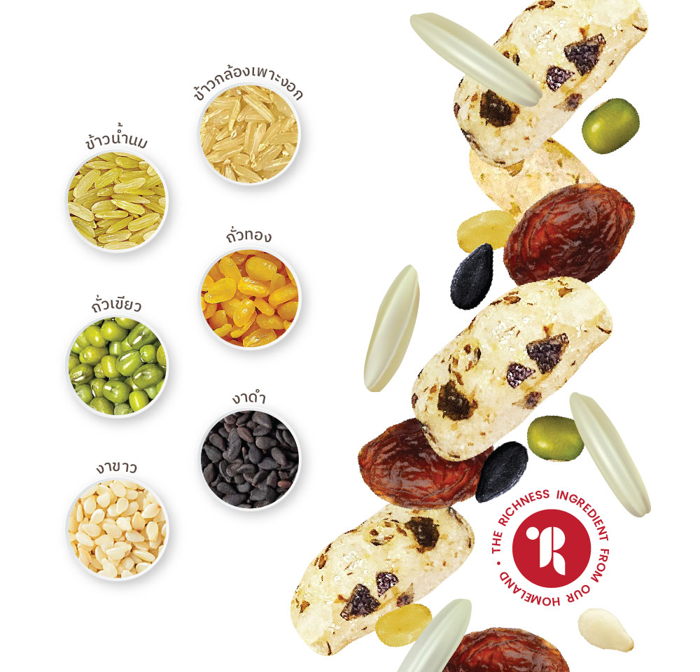 - การผสมผสานวัตถุดิบหลักจากข้าวกับเมล็ดธัญพืชต่างๆ เข้าด้วยกัน ทำให้ได้คุณค่าสารอาหารที่ครบถ้วน